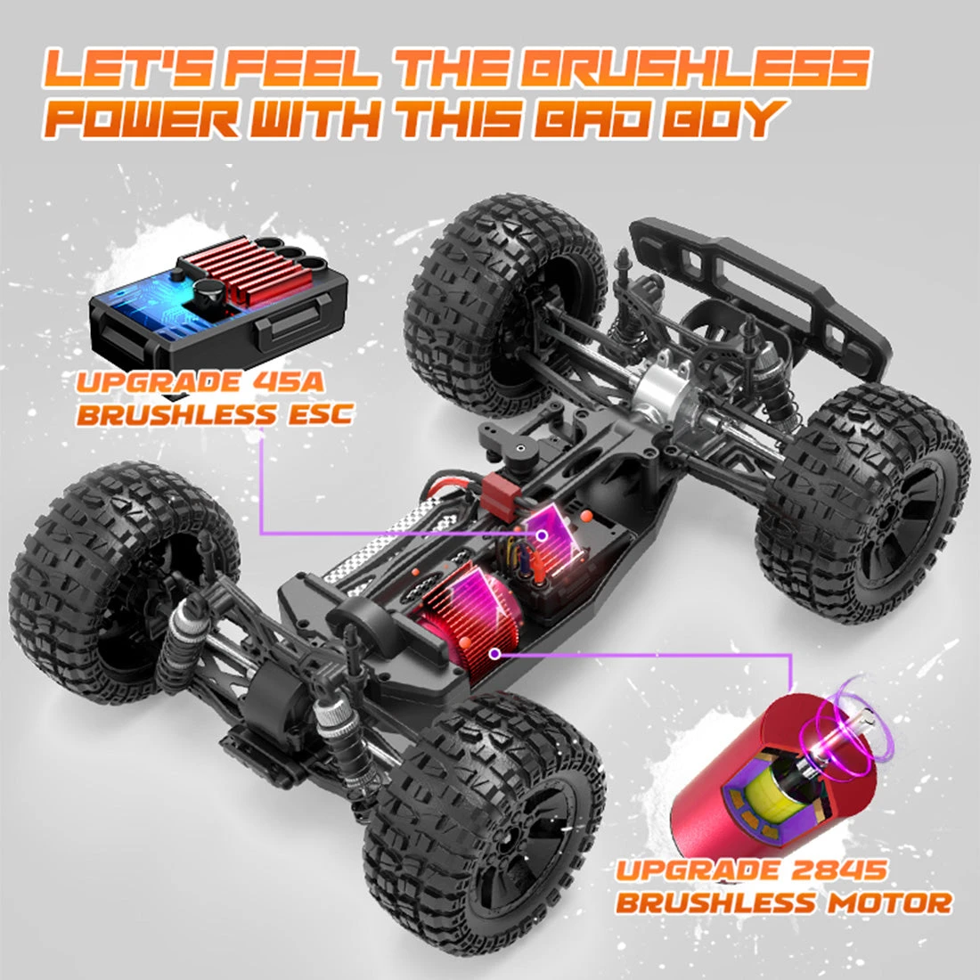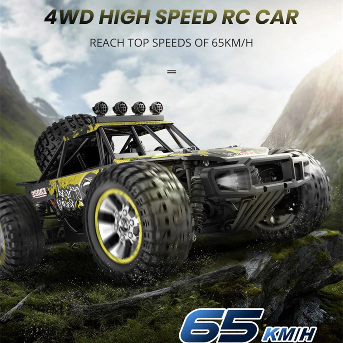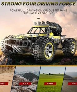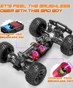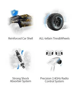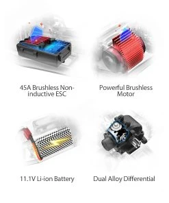 .With a professional 3-wire servo (2.2kg torque), the highest speed of 65km/h along with the reinforced chassis with enhanced strength allow this model to overcome low obstacles, navigate rough terrains, and conquer mountains and water with ease. The unique pattern of the off-road tires provides better wear resistance and stronger grip, enabling it to tackle various complex road conditions.