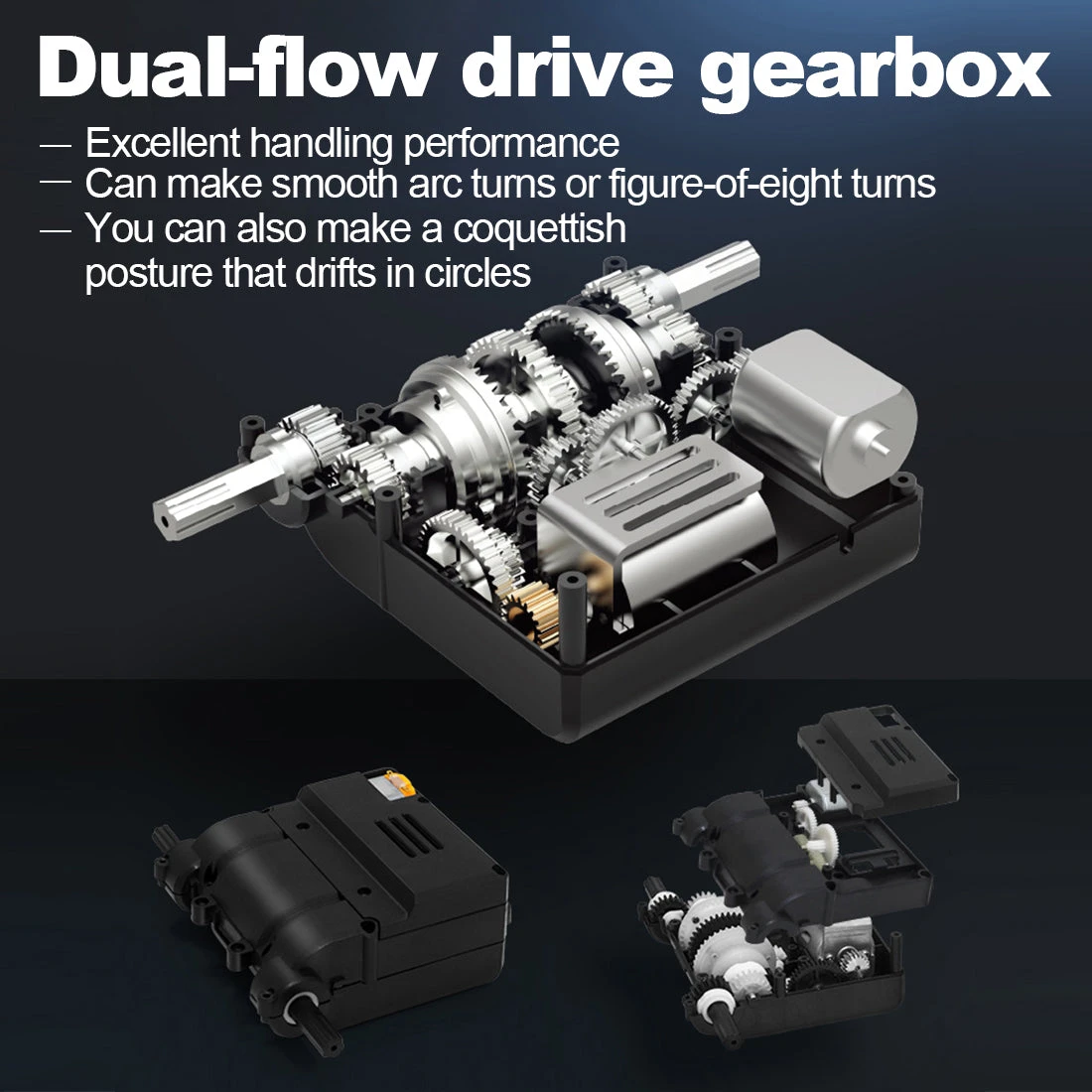 Adopts double planet differential, differential structure simulates double flow drive transmission, and can rotate 360° in place, drift, 30° climb, etc. Gull-wing doors, metal guide bracket, and the front is also equipped with high-intensity LED lights, more attractive driving at night.