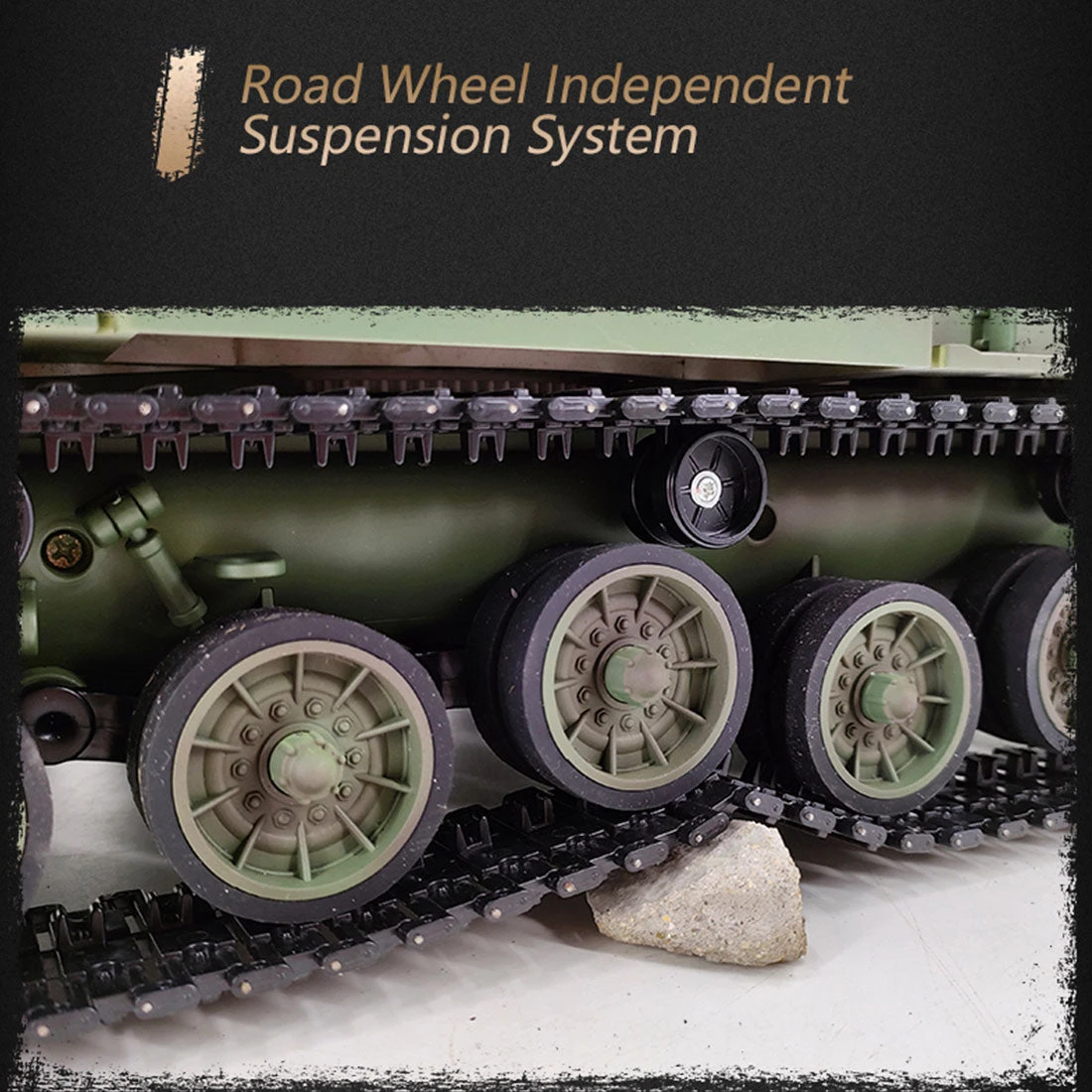 .As a perfect companion, the model boasts abundant playing methods, including moving forward&backward or speed up, authentic smoking, neutral turning, shooting BB bombs while being shockproof, 30° up and down adjustable artillery, 320° rotatable battery, simulated sounds&motion effects, full-scale remote control function, self-modifiable channels to play simultaneously among multiple tanks, super chassis, realistic suspension system, as a commander.