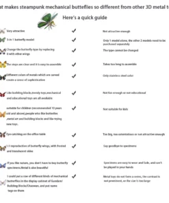 .The wear-resistant retro steampunk toys are made of premium-quality metal materials including stainless steel, iron and copper with many carved parts, textured metal parts, visible wing texture with matte/bright surface (remember to tear the film on the bright side) and a thickness of 3-4mm to perfectly restore the real butterfly wings.