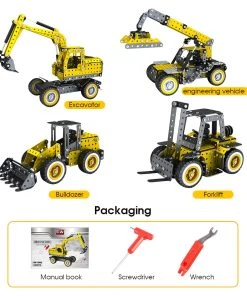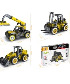 . Construction vehicle toy combination: contains 005 forklift forklift + 006 crane + 007 excavator + 008 bulldozer, through the assembly can improve knowledge, understanding of construction vehicle structure, the parts of the articulation; . Details: gear has a mechanical transmission device, high simulation, in the process of pushing the car gear transmission device can drive the engineering vehicle work parts movement, so that the car more play cool; .