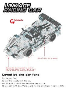. Cool racing car shape: full manual high difficulty assembly, experience the fun of creating technology. 3D metal structure design exquisite and clever, high simulation, metal texture. Wheel and steering wheel linkage, can be synchronized steering, a variety of modes of operation, a variety of occasions to play.