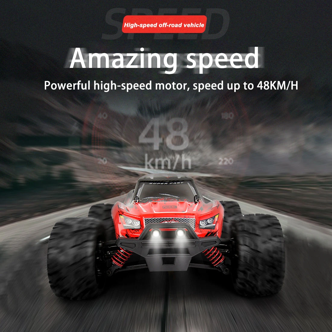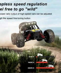 The vehicle is equipped with 390 strong magnetic high-speed motor, stepless speed regulation, and the vehicle power ratio output is adjusted through the fine-tuning button. Through 2.4GHz ultra-long-distance remote control, the vehicle speed can reach up to 48KM/H.