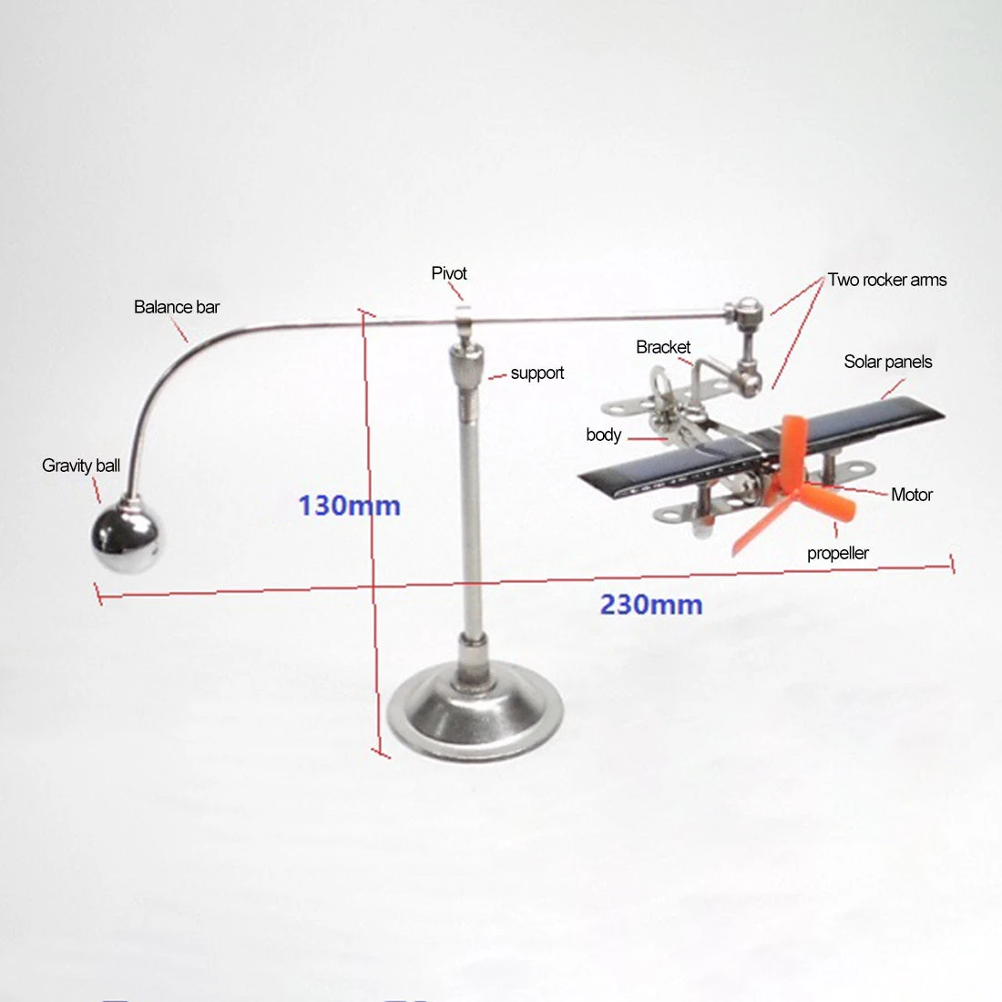 .Product Detail: The airplane model on the part of the balance bar with motor, propeller and solar panel. The other side of the balance bar is gravity ball which is made from stainless steel to make the model more stable.