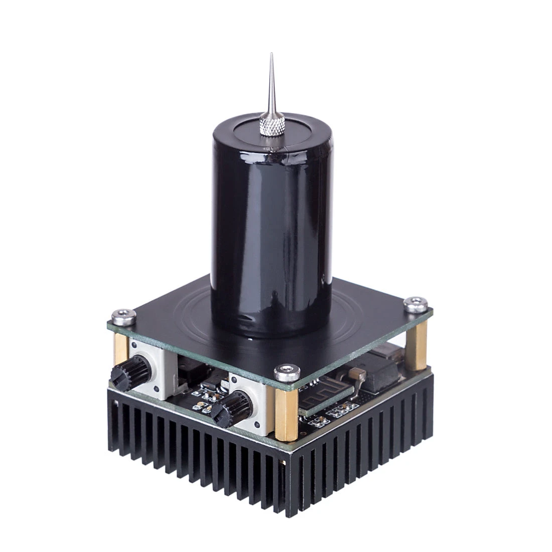 .Instructions for Use: 1: Assemble the electrode pins (the electrode pins must be assembled before starting up); 2: Connect one end of the adapter to the socket and the other end to the DC connector; 3: Connect one end of the audio cable to the smartphone or computer, and the other One end is connected to the circuit board; 4. When the switch is turned down, an arc can be generated. Adjust the left and right knobs clockwise to adjust the arc to be thicker or more; 5. Toggle the switch up to switch to music mode. Use Bluetooth (or self-provided audio cable) to connect to the mobile phone, you can play square wave music processed specifically for Tesla coil; 6. Toggle the switch to the middle is the standby mode