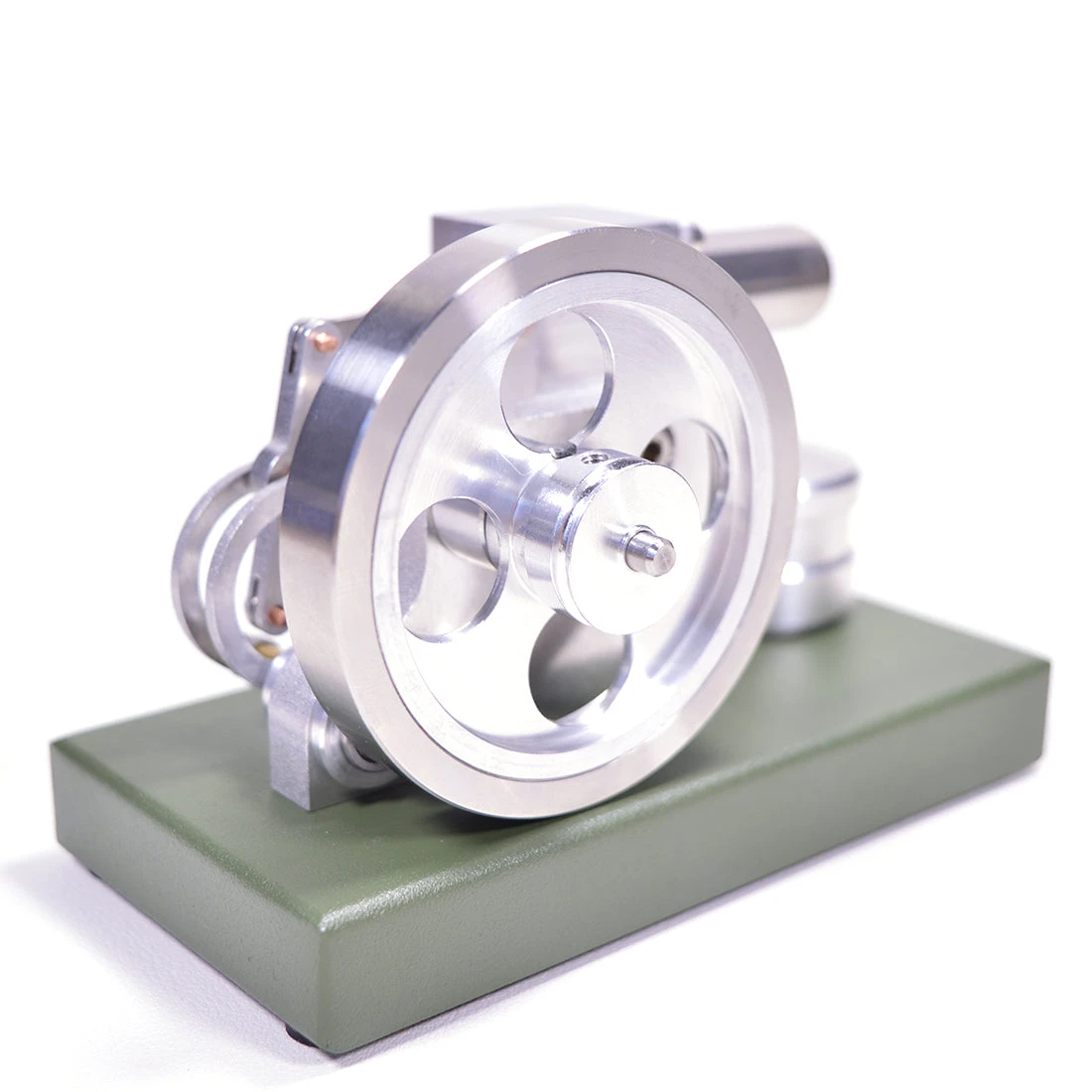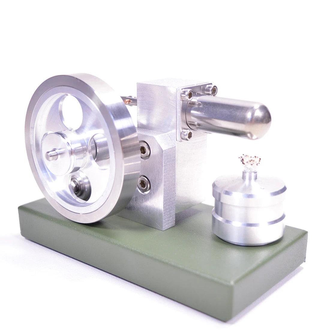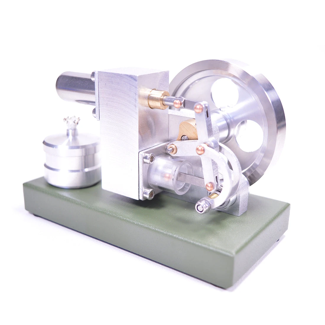 The machine has been assembled and tested, you just need to place the engine model on the horizontal table, inject 95% alcohol into the spirit lamp, ignite the spirit lamp, dry burn the air in the cylinder to generate pressure power, after 30 seconds of preheating, hand flick the flywheel to help start