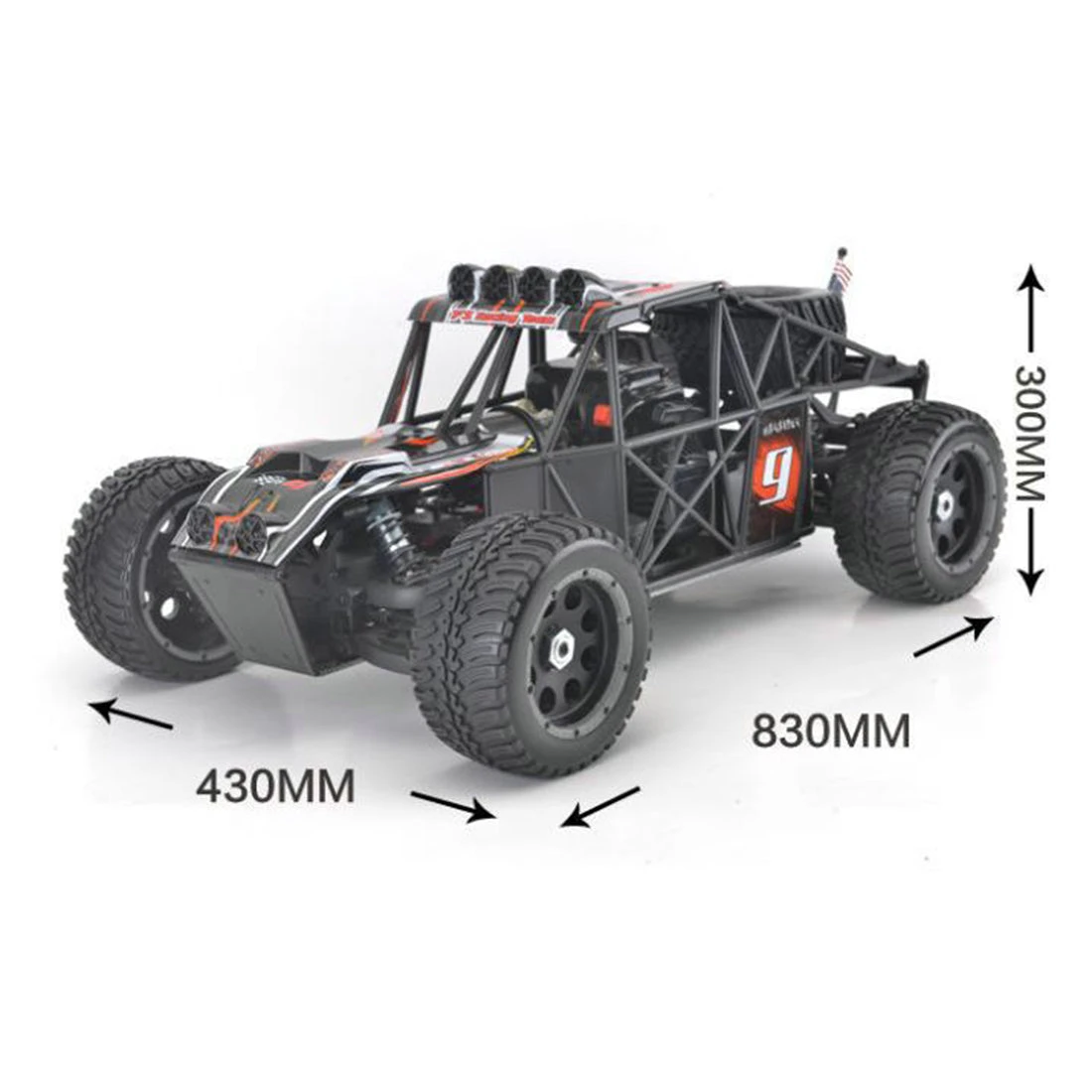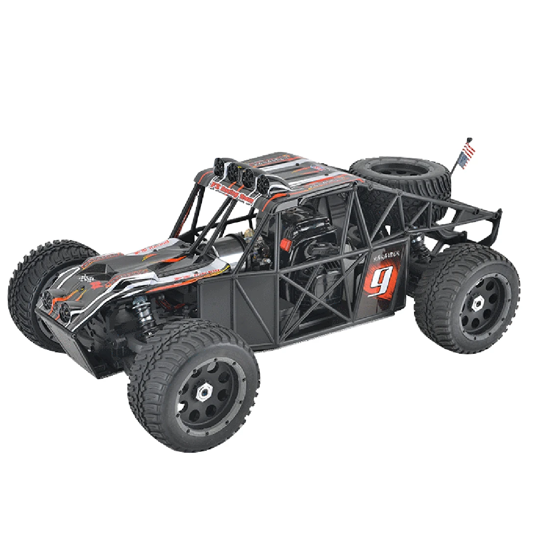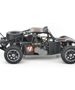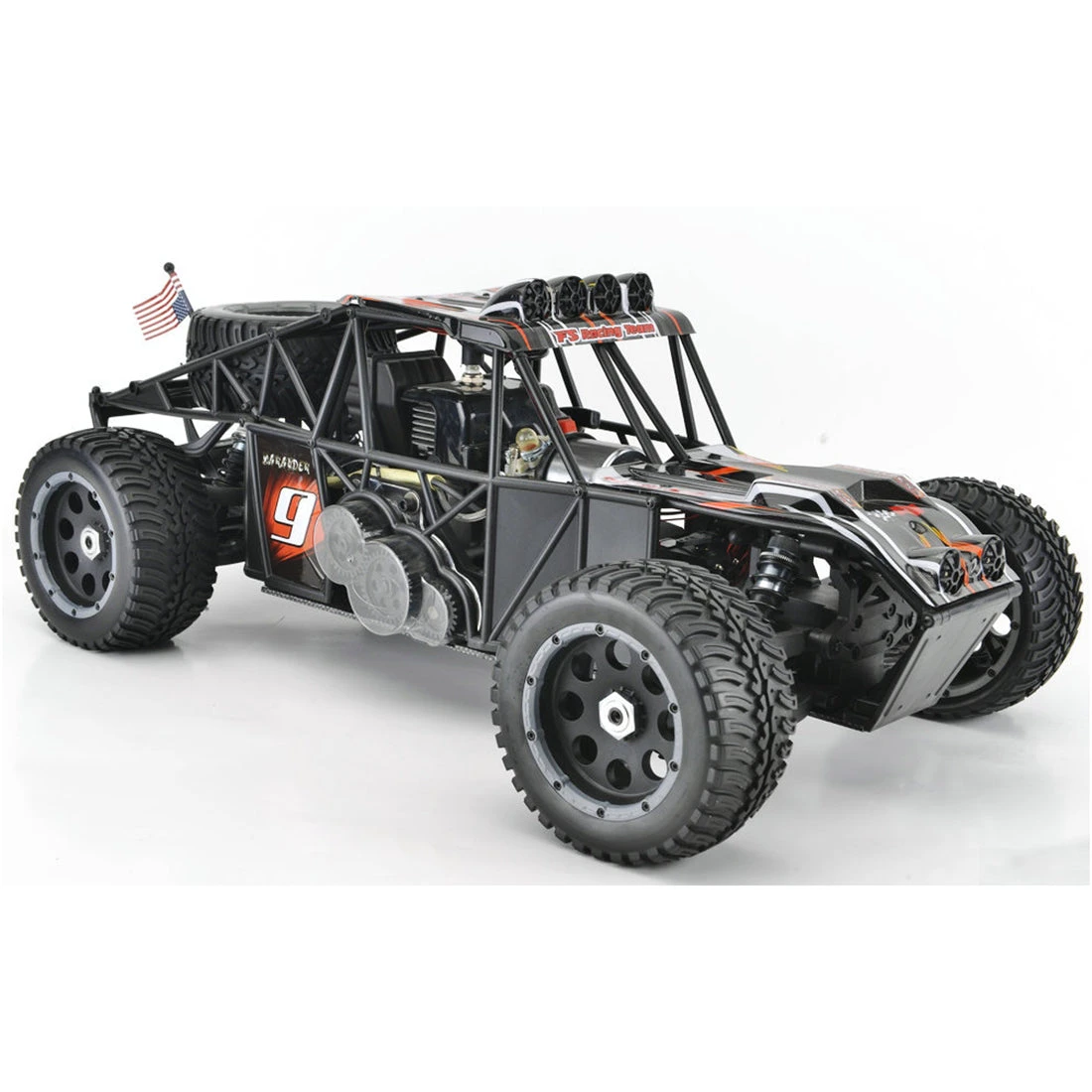 .2.4G radio control system, full-time four-wheel drive system, high-displacement gasoline engine, provide strong power, high-performance exhaust pipe, universal new hexagonal bushing design, suitable for HPI models.