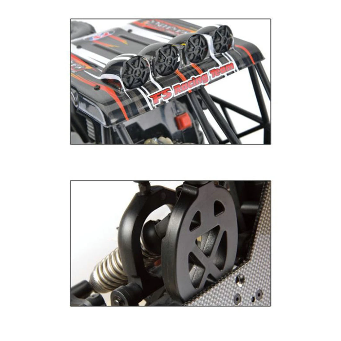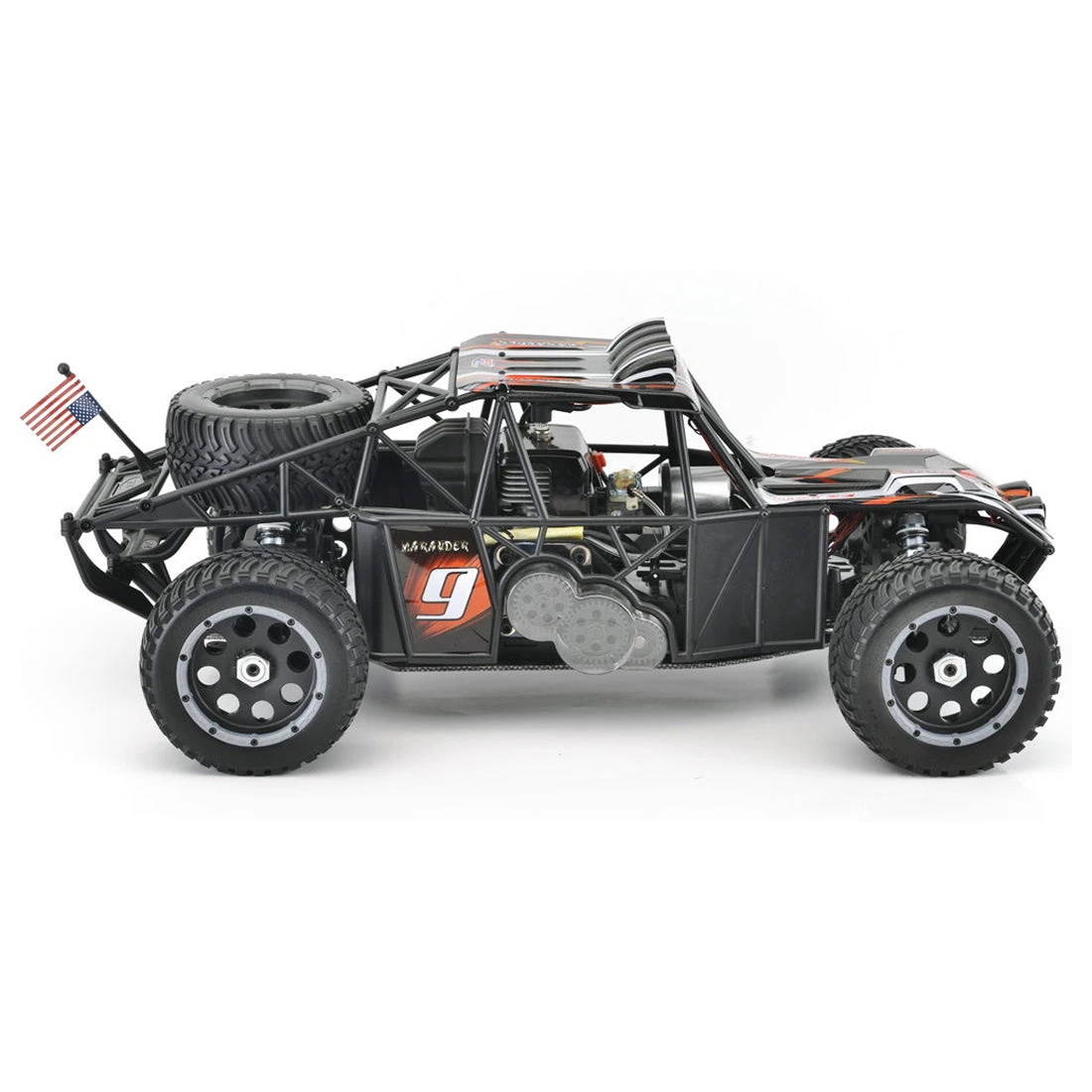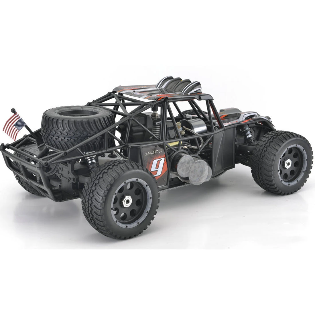 .2.4G radio control system, full-time four-wheel drive system, high-displacement gasoline engine, provide strong power, high-performance exhaust pipe, universal new hexagonal bushing design, suitable for HPI models.