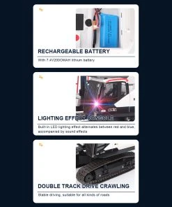 1:14 high simulation modelling ratio, 2.4G wireless omni-directional remote control, 22CH can go forward, backward, turn left, turn right, the console can rotate infinitely 360°, built-in LED lighting effect, dual crawler drive crawling, boom Each joint of, forearm, bucket, etc. can be operated independently by remote control, simulating the function of excavation operation.