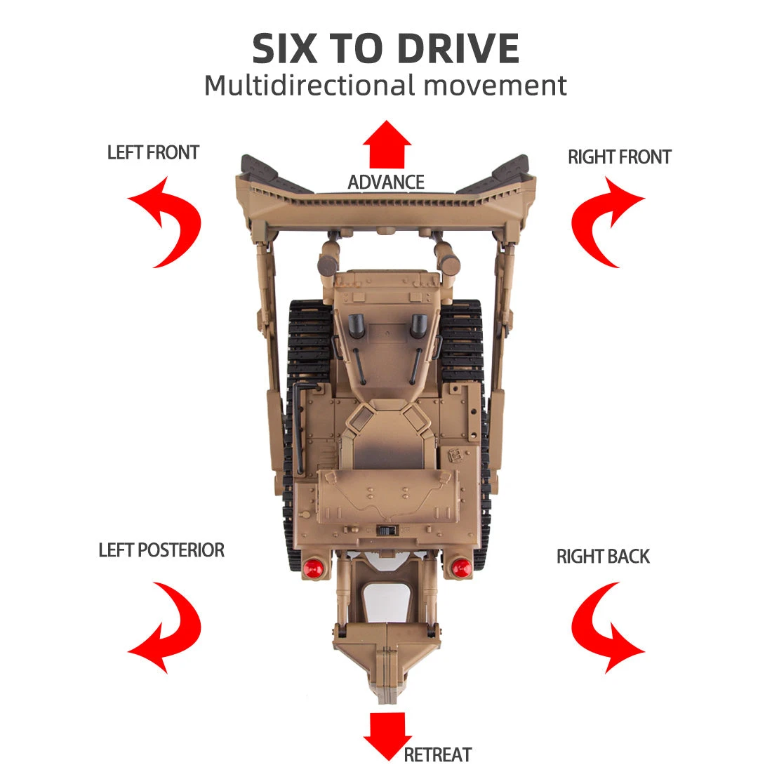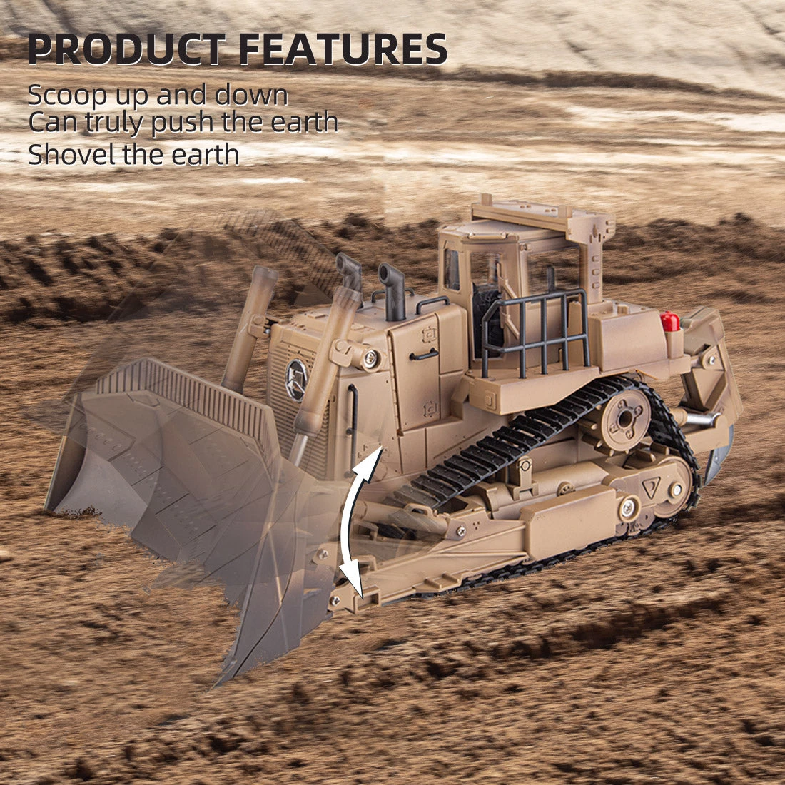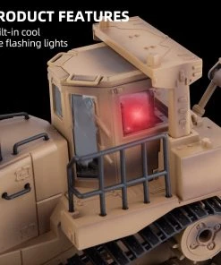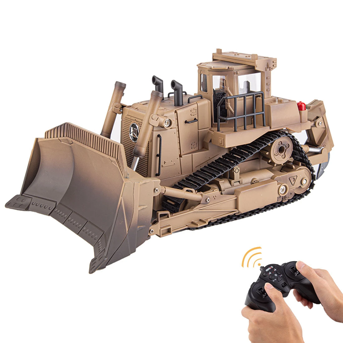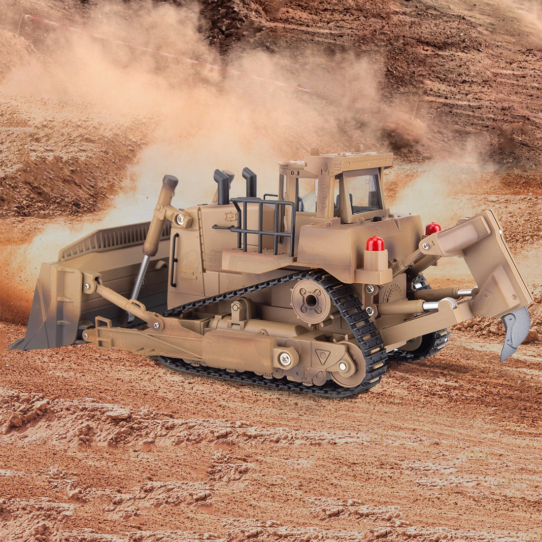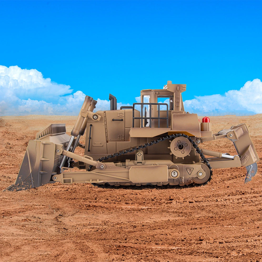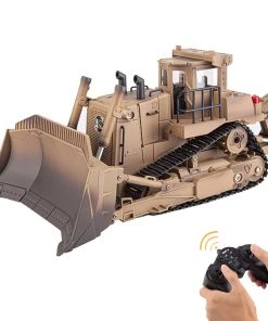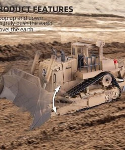 The 1/16 larger bulldozer in Khaki painted boasts impressing design details, detailed functions, and a sturdy structure, adding LED lights and simulated motor sound make the model a real engineer bulldozer on the battlefield.