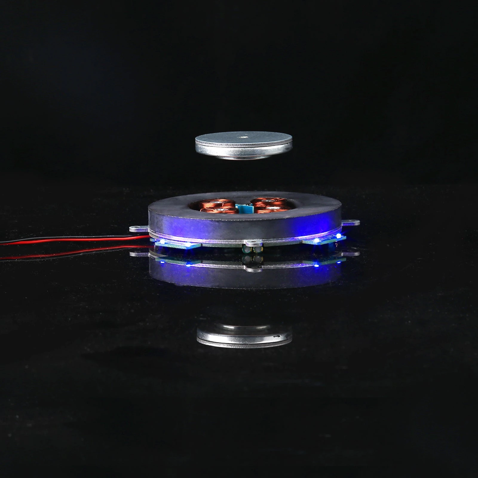 The product has been assembled, just connect the main board to the power supply, put the small side of the floating magnet downward, slowly approach the center of the circuit board from top to bottom, and slowly release it after locking. If you place objects on the suspended platform, do not exceed the carrying weight.