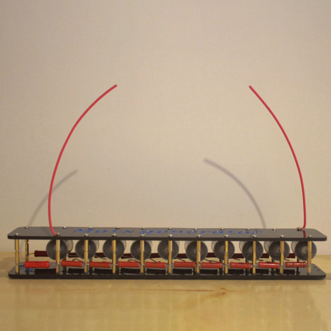 The Marx generator uses a 10-20KV high-voltage DC power supply and outputs a high voltage of hundreds of thousands to hundreds of thousands of volts. 10-stage arc 15-20cm, voltage 200000V. It is strictly forbidden to touch the Marx generator and high-voltage power supply when the power is on! After each test, use a screwdriver or other metal with an insulating handle to touch the two copper poles at the input end of the 20KV power supply at the same time, and discharge the residual electricity in the capacitor before touching the Marx generator.