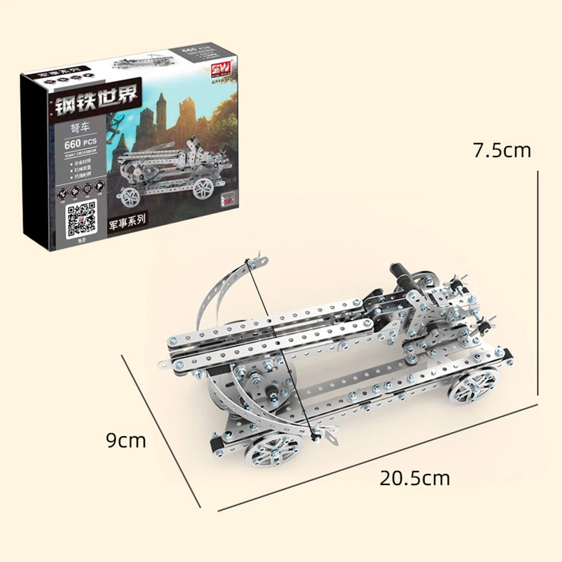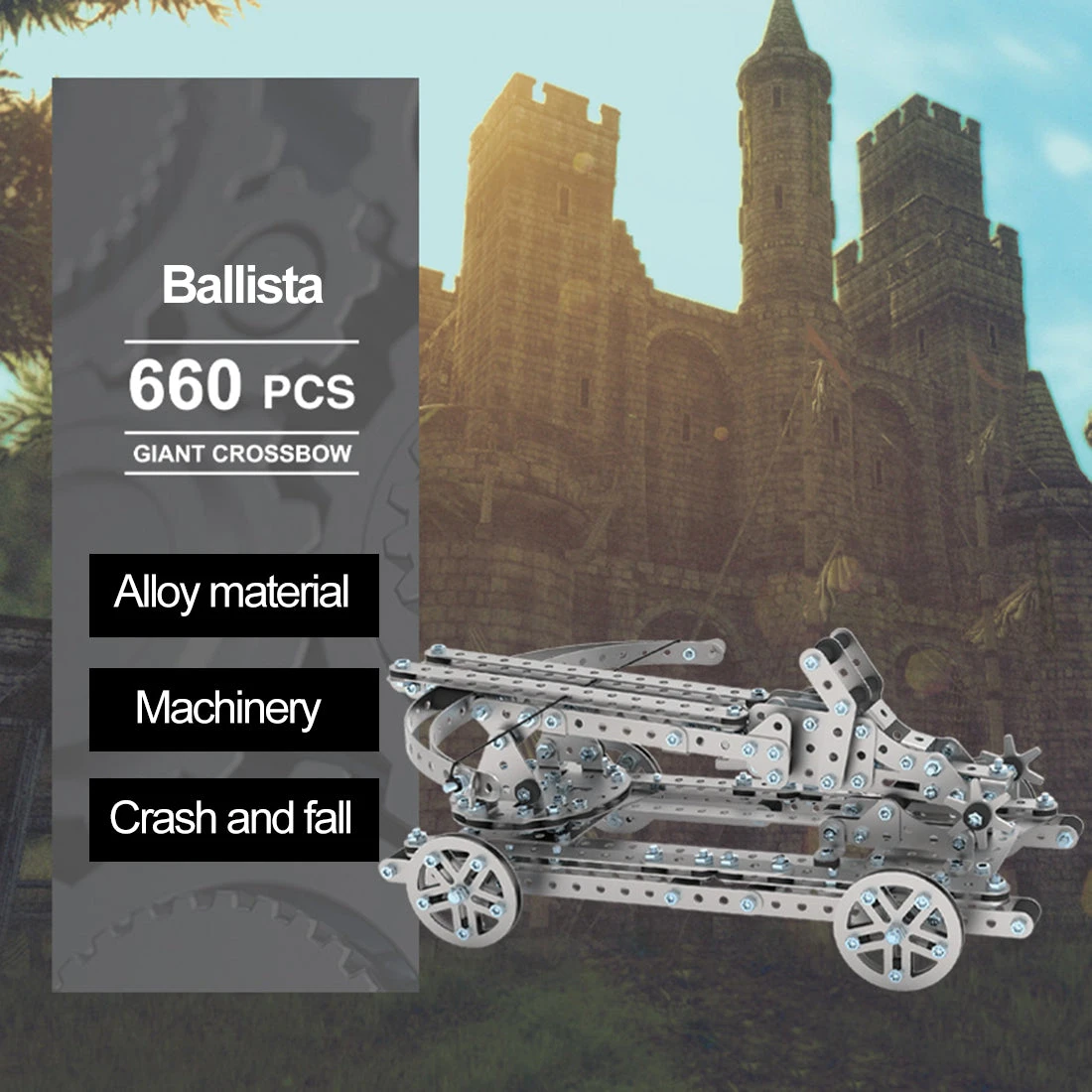 .The ballista, one of the powerful medieval siege weapons, is made of copper and built with the mechanical transmission device and 180° adjustable launch angle for large span in mobility.