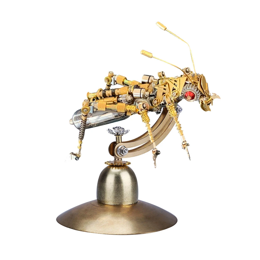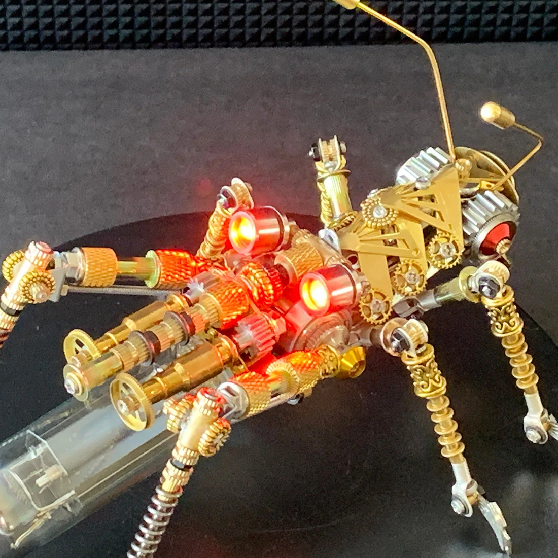 The mechanical locust model features a mouth able to open and close, two antenna-like tentacles, precision engraving on leg parts, red eyes, a light bulb on the back that emits red light, and a nonluminous tail consisting of microwave oven electronic components.