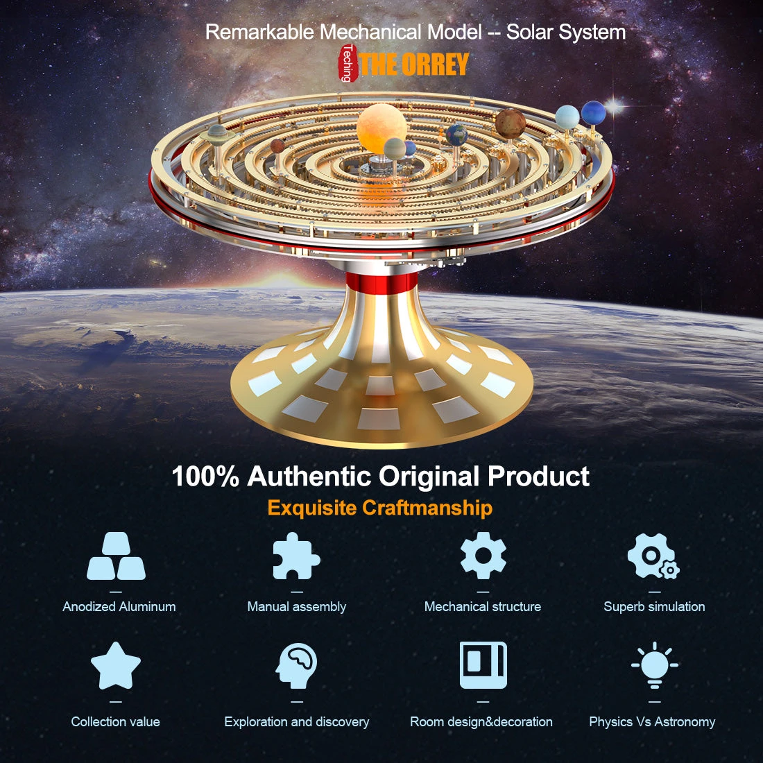 This solar system planetary instrument will not only make scientific and mechanical engineering technicians excited, And it is very suitable for home decoration, school teaching, company office display and personal collection, etc. The product is packaged in a high-grade metal gift box, it is the perfect gift for children or adults that is irresistible and satisfying