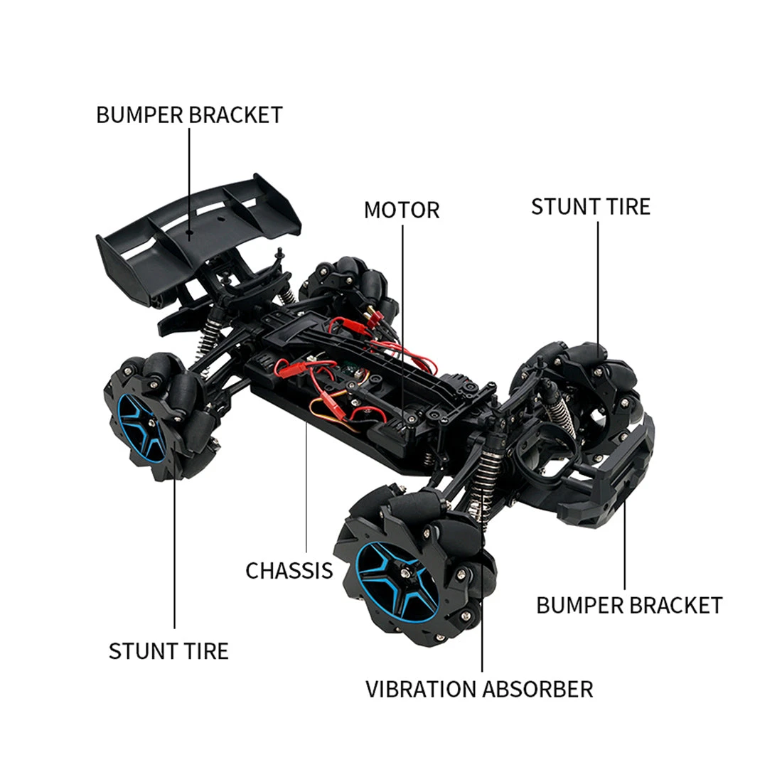 This car is equipped with high-power IC for unlimited speed change, free control of the throttle, brake function for rapid deceleration, and 10KG high torque steering gear, which can freely adjust the turning angle, free acceleration and deceleration, and better maneuverability. There is a straight line fine-tuning function, as well as a creep mode to a sports mode adjustment. The standard maximum speed can reach 45KM/H, which makes the car race faster than other vehicles.