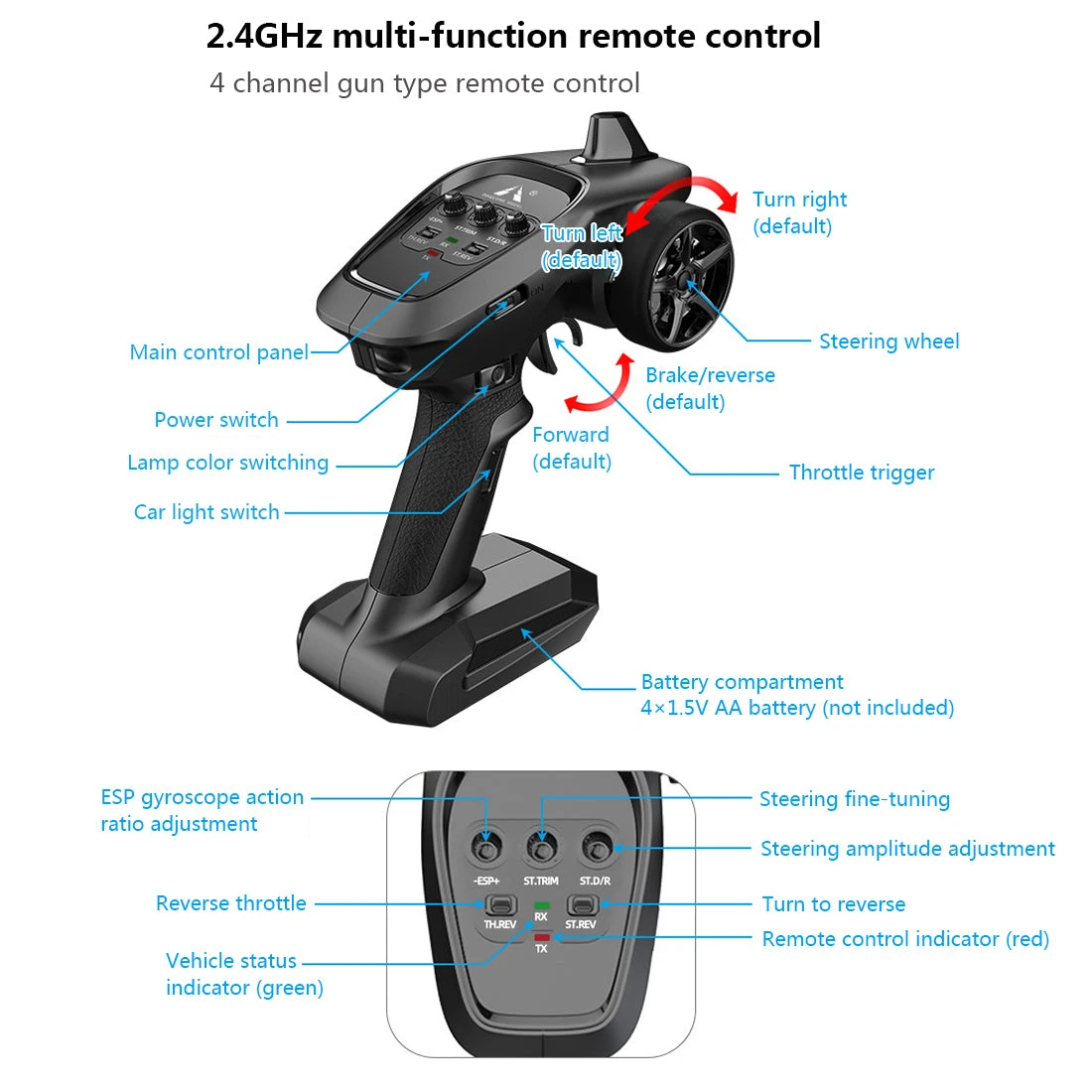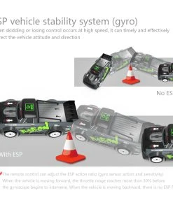 When a side slip or loss of control occurs at high speed, it can timely and effectively correct the vehicle posture and direction. The remote control can adjust the ESP action ratio (gyro sensor action and sensitivity).