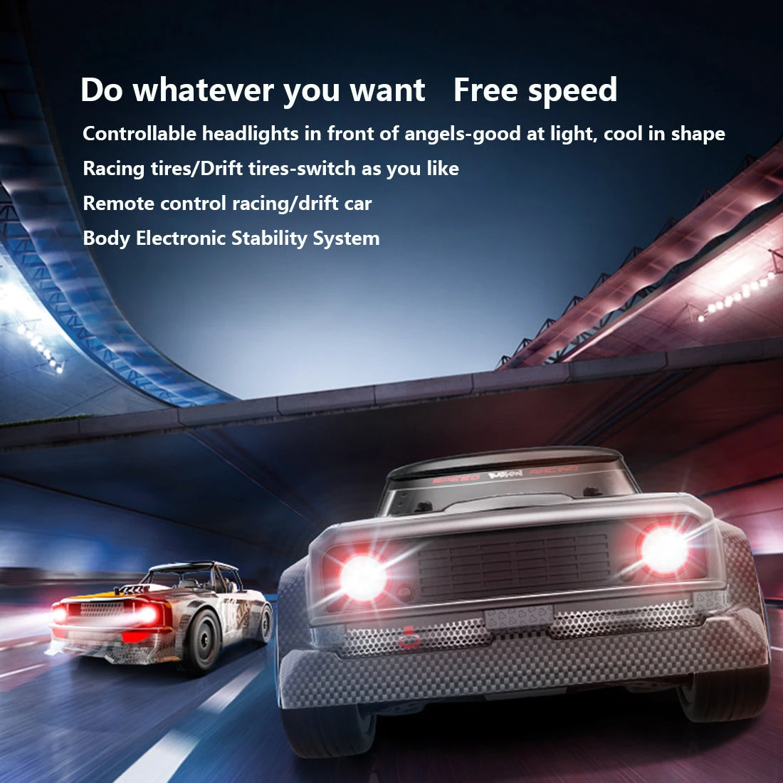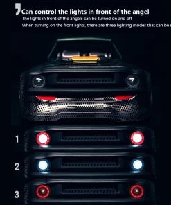 4WD drive, 2.4GHz wireless control system, anti-interference, multiple people can compete in the same field, equipped with full-proportional synchronous control functions such as forward, backward, left and right turns, brakes, battery overcharge protection, overcurrent Protective function. Equipped with controllable angel headlights, which can be turned on or off. There are three lighting modes that can be switched when the headlights are turned on.