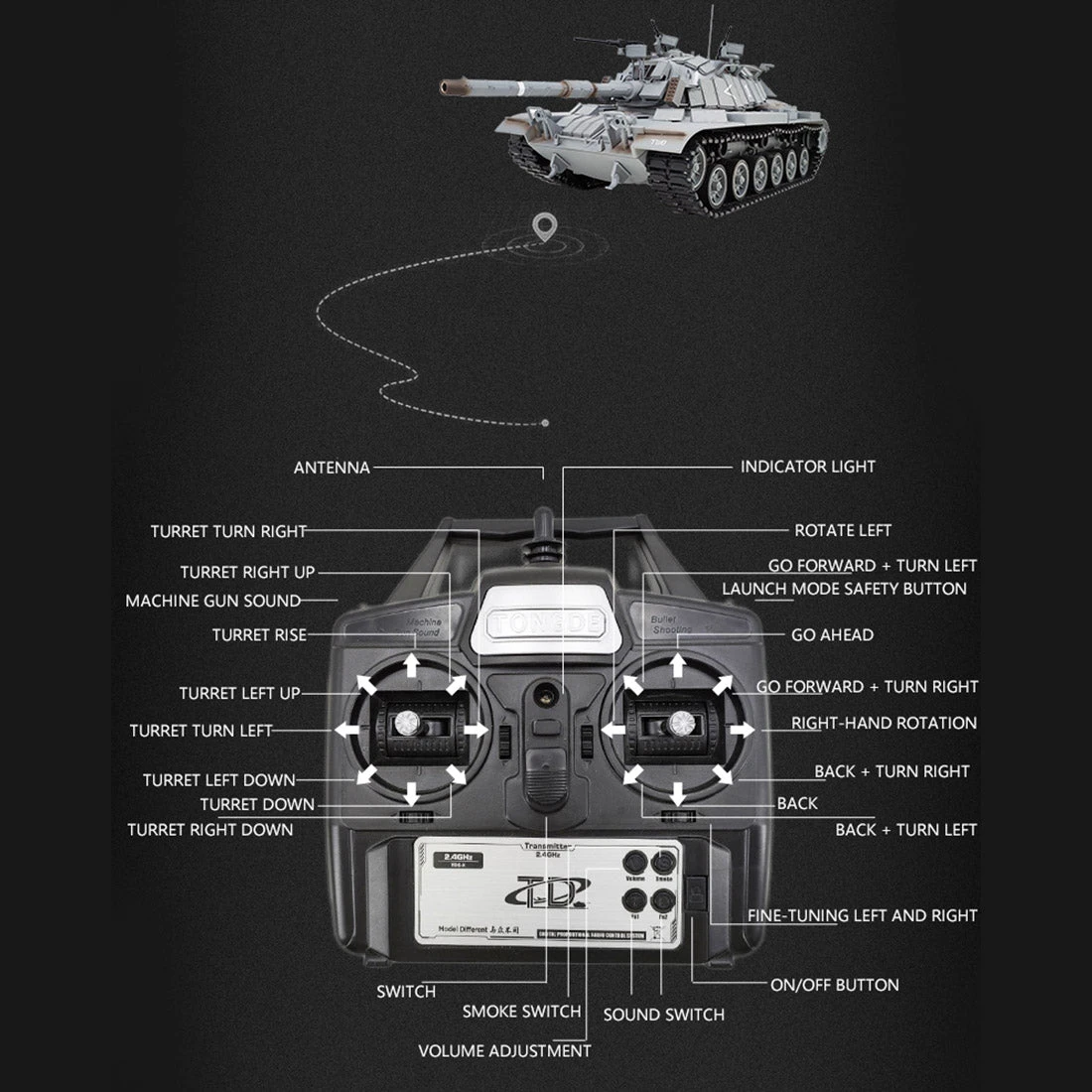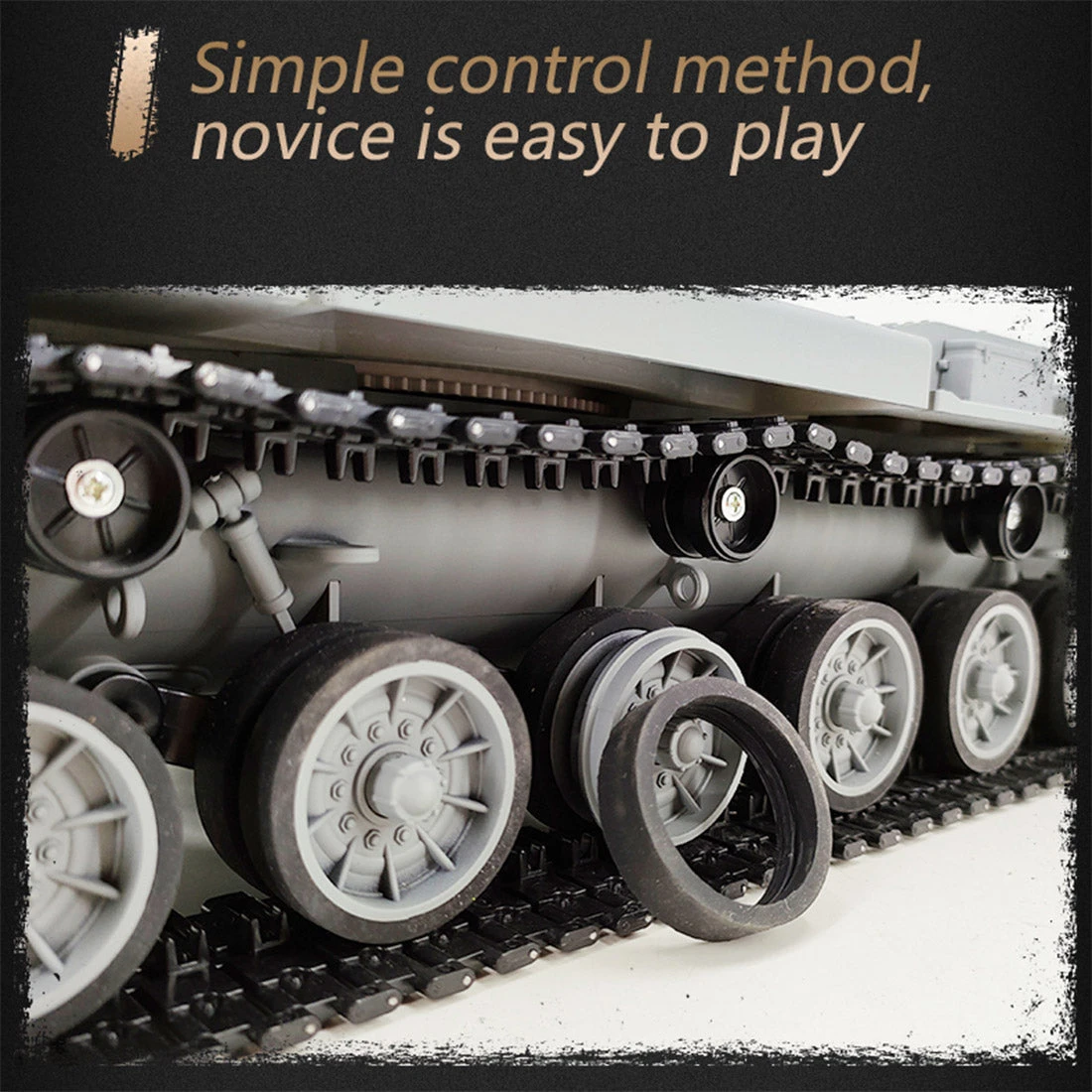 2. The rich playability is the only choice for it to be a partner, which includes: forward, accelerate forward, backward, accelerate backward, smoke, rotate on the ground, fire BBs and recoil at the same time, barrel lift 30 degrees, turret rotation 320 degrees, simulation sound and action effects, full scale remote control function, channel can be changed by itself, can be multiple games at the same time, realistic smoke device, super chassis, realistic suspension system, realistic commander, etc.
