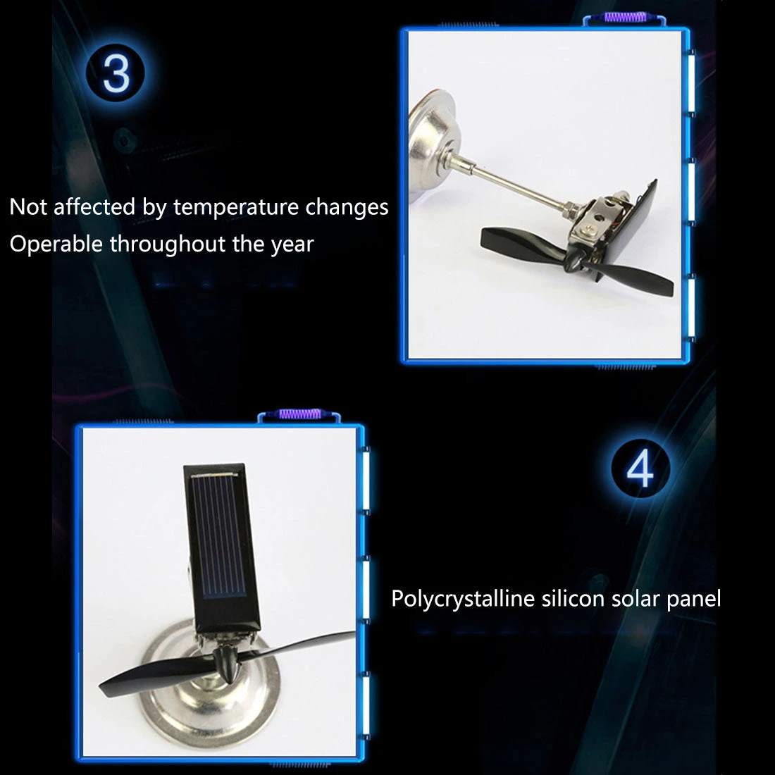 Solar powered windmill motor model, and the base come with car glue, which can be used for car-mounted. The inside is clearly visible, which makes it easy to observe the principle. It is not affected by temperature changes and can be rotated throughout the year. Polysilicon solar panels. Made of metal, beautiful and durable.
