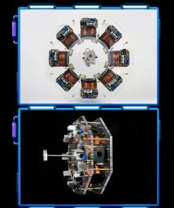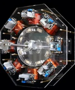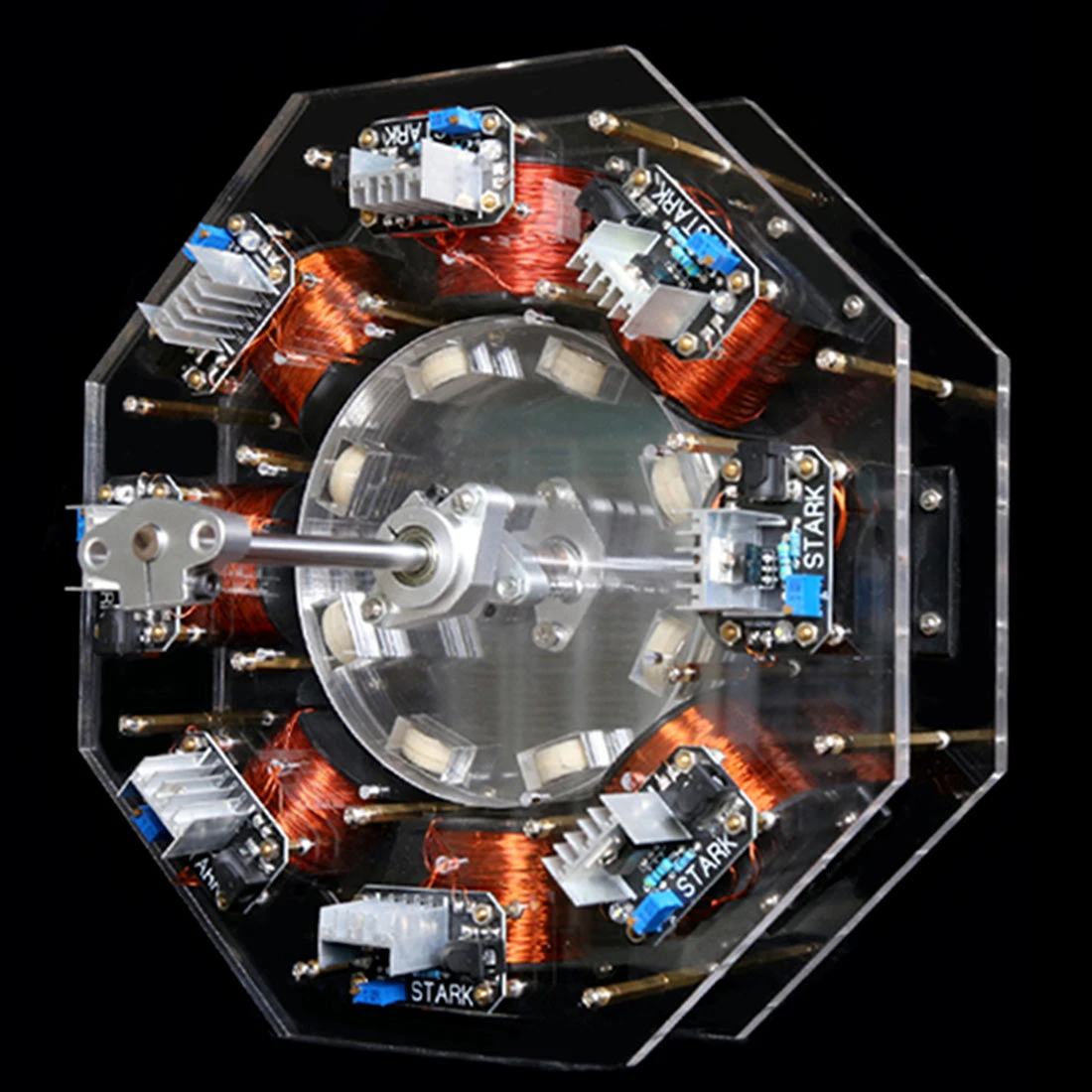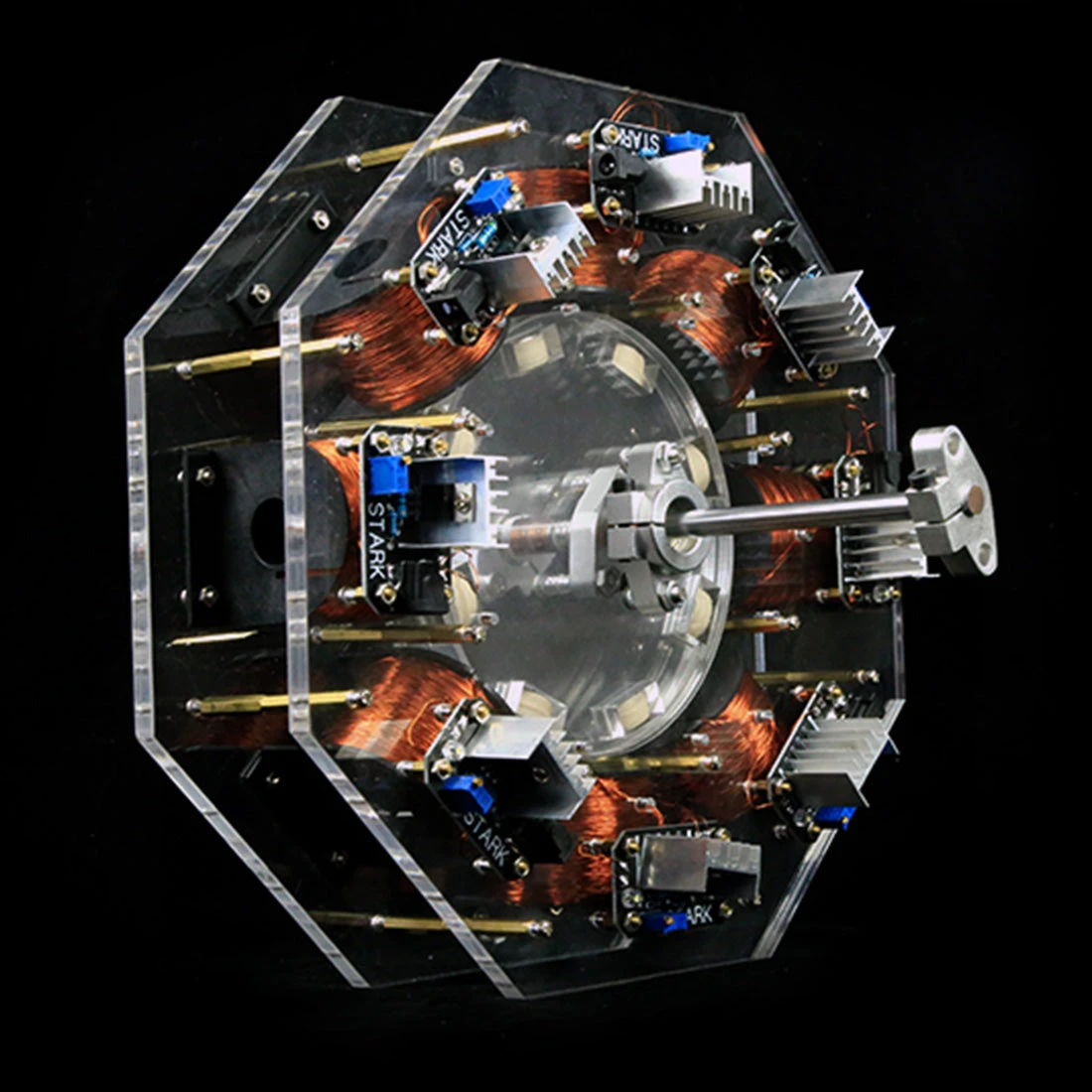 This product is composed of 8 circuit boards and 8 coils, each coil corresponds to a circuit board, does not interfere with each other, and can be energized at the same time or a single coil. The circuit adopts a self-excited structure. Each coil is formed by winding two wires at the same time. The thick wire is the driving coil and the thin wire is the signal coil. When the magnet passes through the coil, the signal coil will generate an electromotive force voltage, the voltage will turn on the mos tube, supply power to the drive coil and generate a magnetic field, thereby attracting or repelling the magnet, let the rotor move, and the next magnet will also attract when it reaches the same position Force or repulsive force, so that the rotor has been moving in one direction.