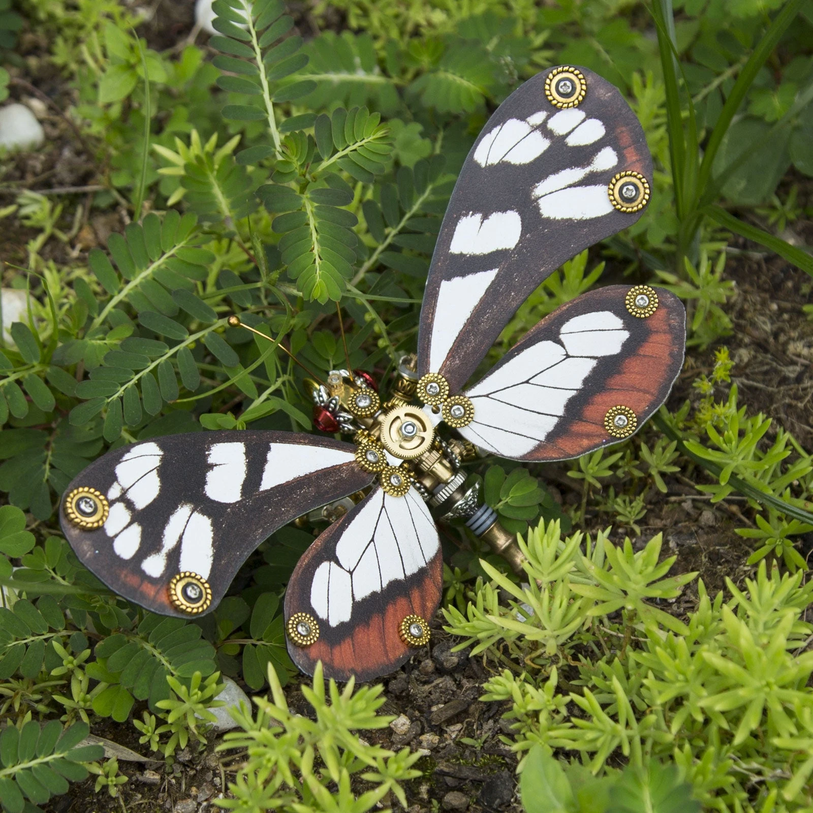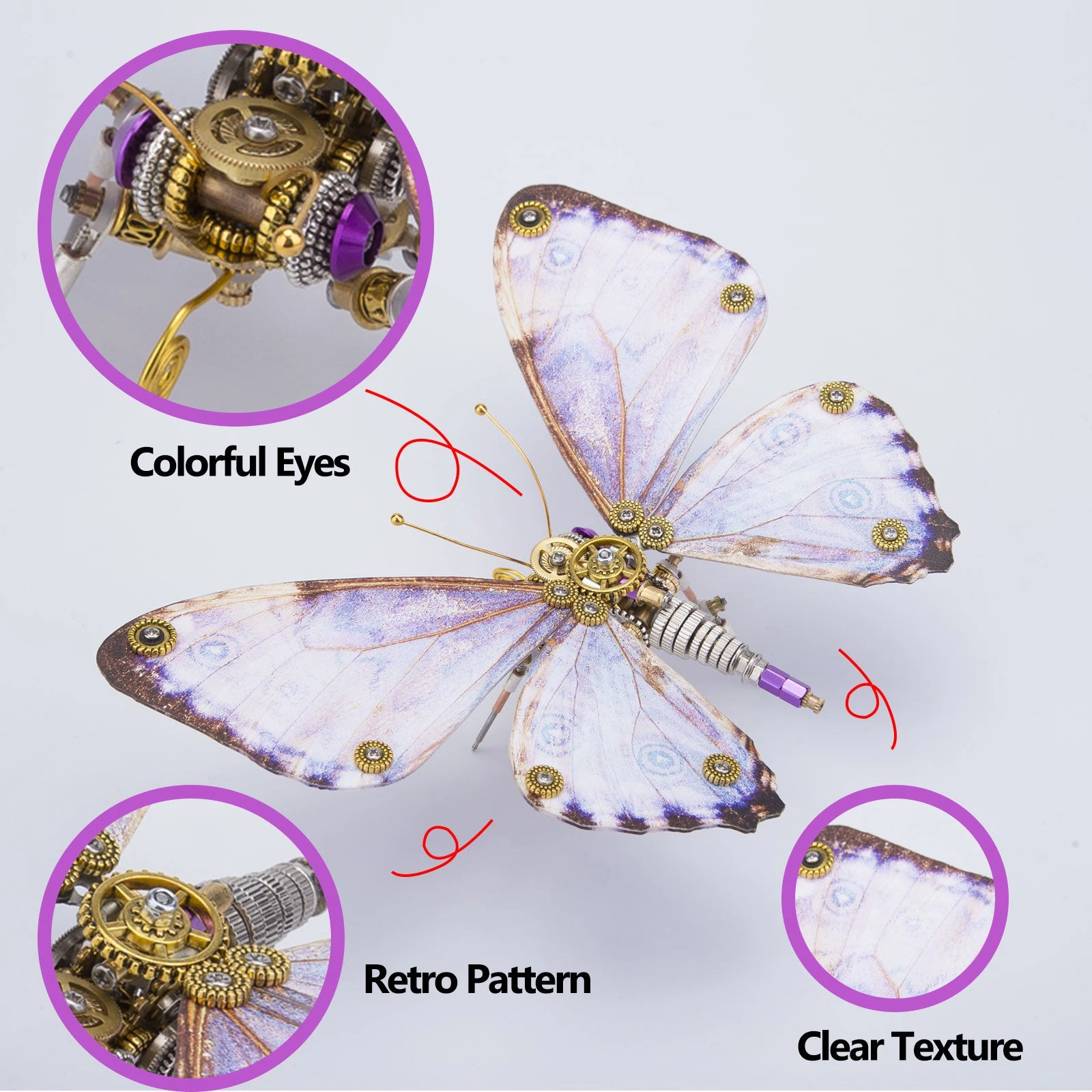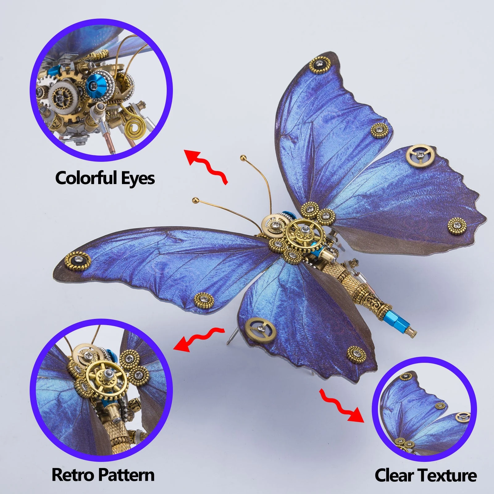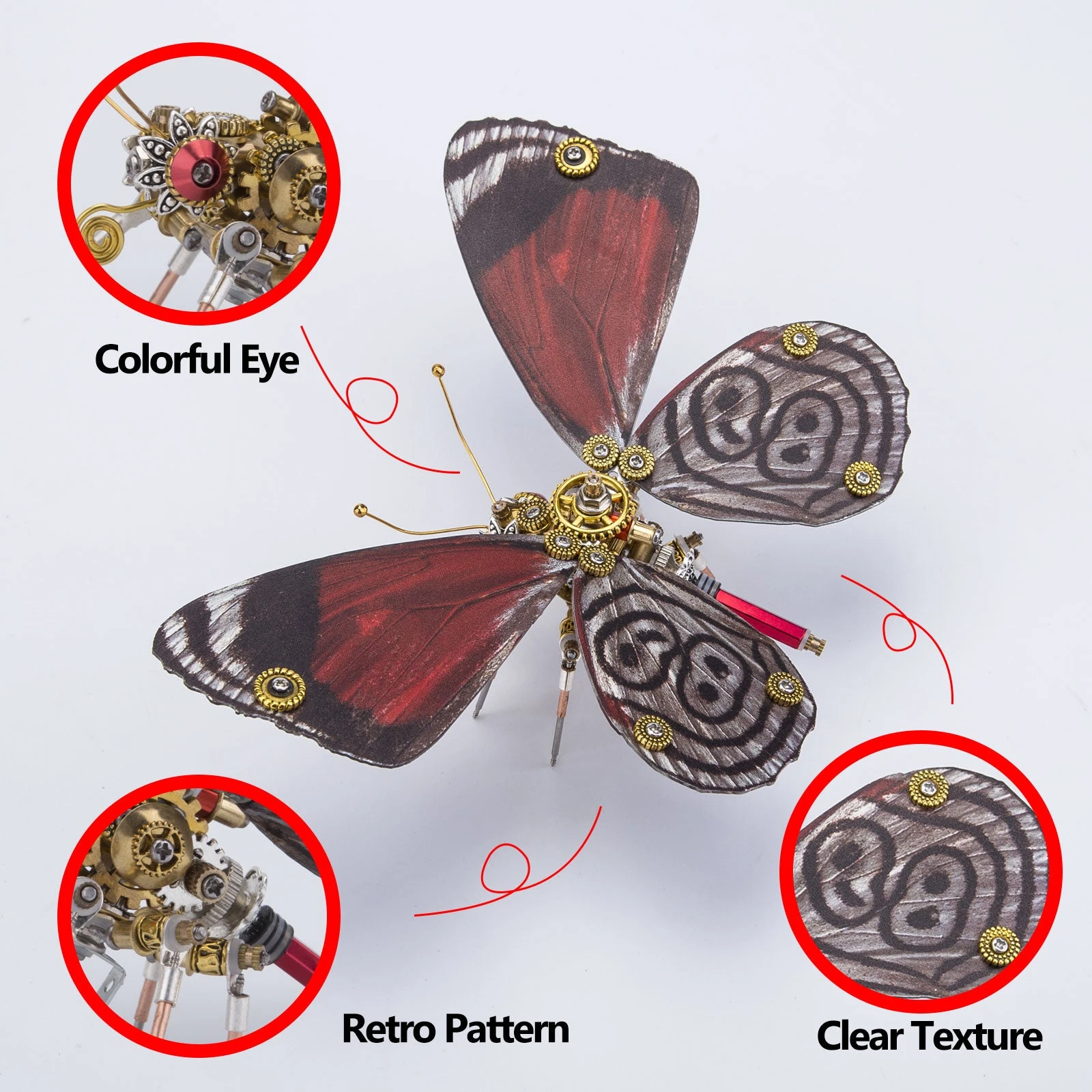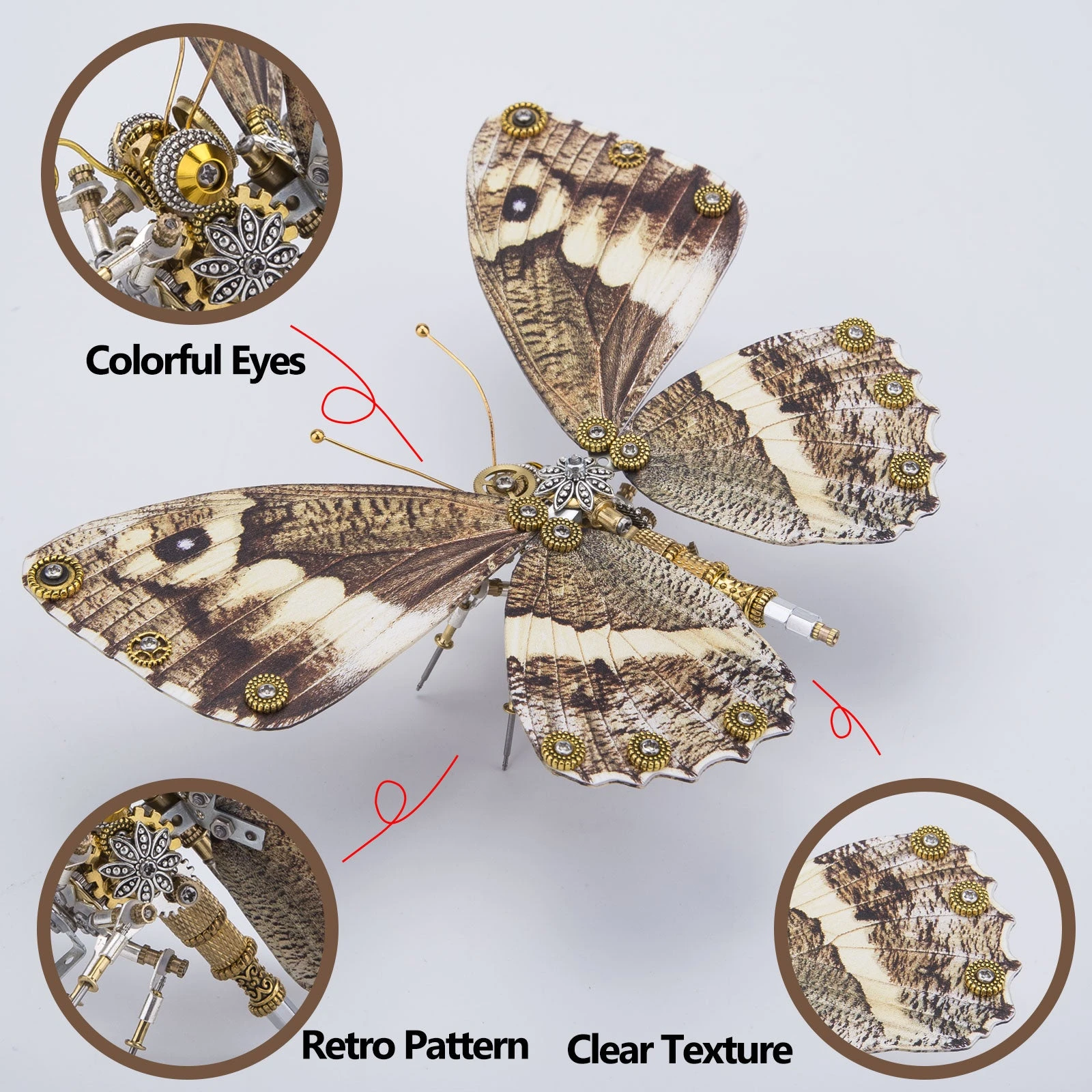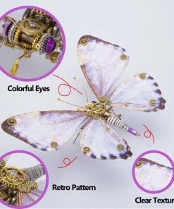 .The model is made of premium-quality metal materials including stainless steel, iron and copper with many carved parts to create a retro steampunk style. Features visible wings texture with a thickness of 3-4mm for wear resistance, restoring the real butterfly wings.