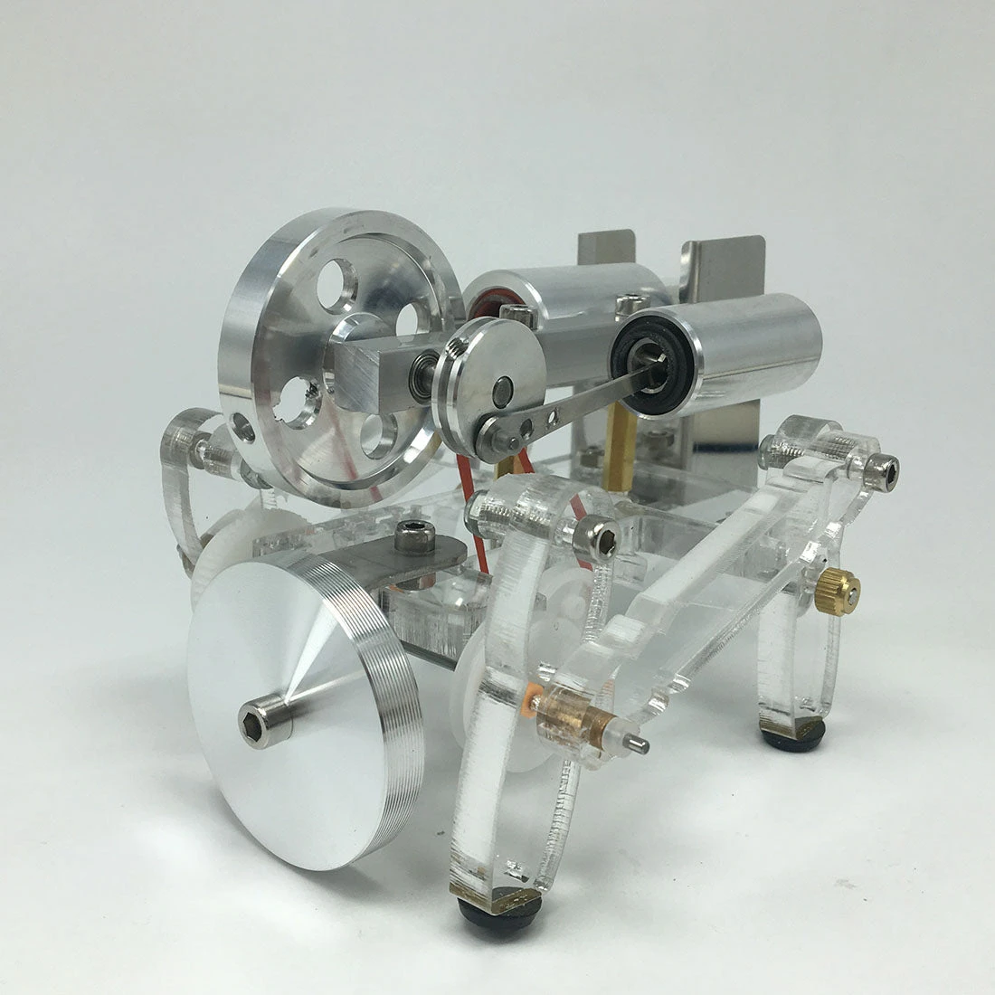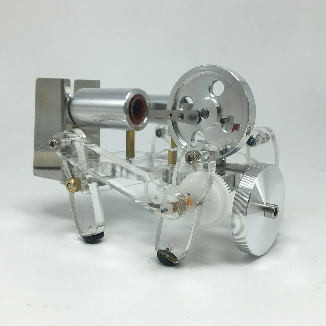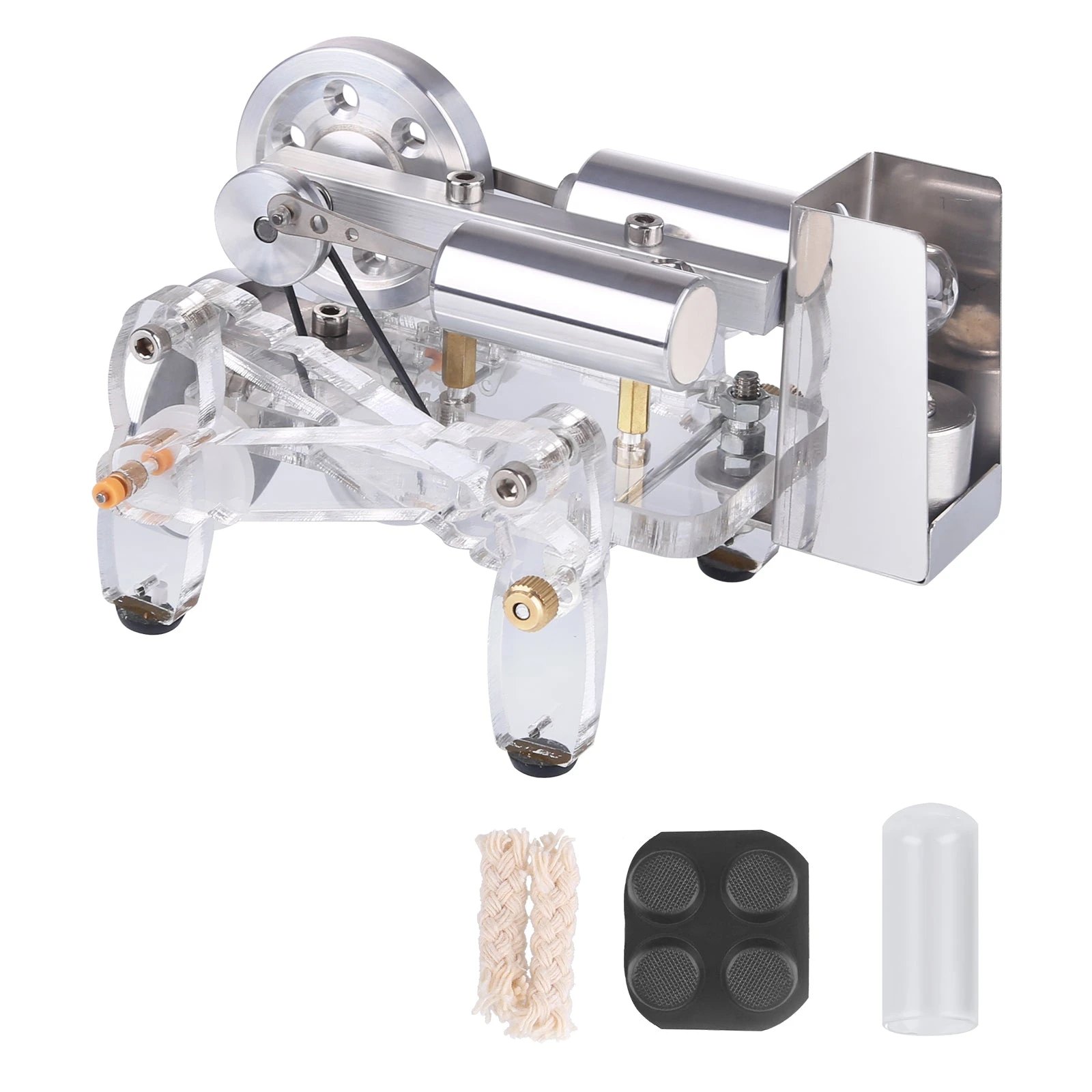 The main body of the Stirling engine is made of aluminum alloy, and the feet are made of acrylic material. The whole is more exquisite and beautiful. The model is equipped with an alcohol lamp mounting bracket, which is safer and more reliable to use. The model runs smoothly and is durable.