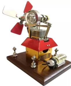 The Stirling engine model is with windmill fan design. This Stirling Engine is a heat engine that operates by cyclic compression and expansion of air or other gas, the working fluid, at different temperature levels such that there is a net conversion of heat energy to mechanical work.The engine is like a steam engine in that all of the engine’s heat flows in and out through the engine wall.
