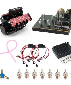V8 Engine Set with Base and Ignition System: Include the kit version engine, ignition accessories, radiator and base set equipped with screws, the engine bracket, power switch, starting button, pressure relif tank, metal fuel tank, temperature display, voltage display and indicator light