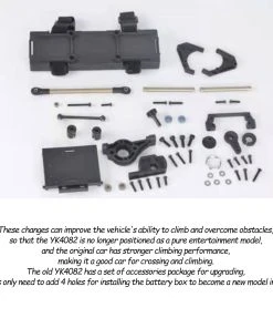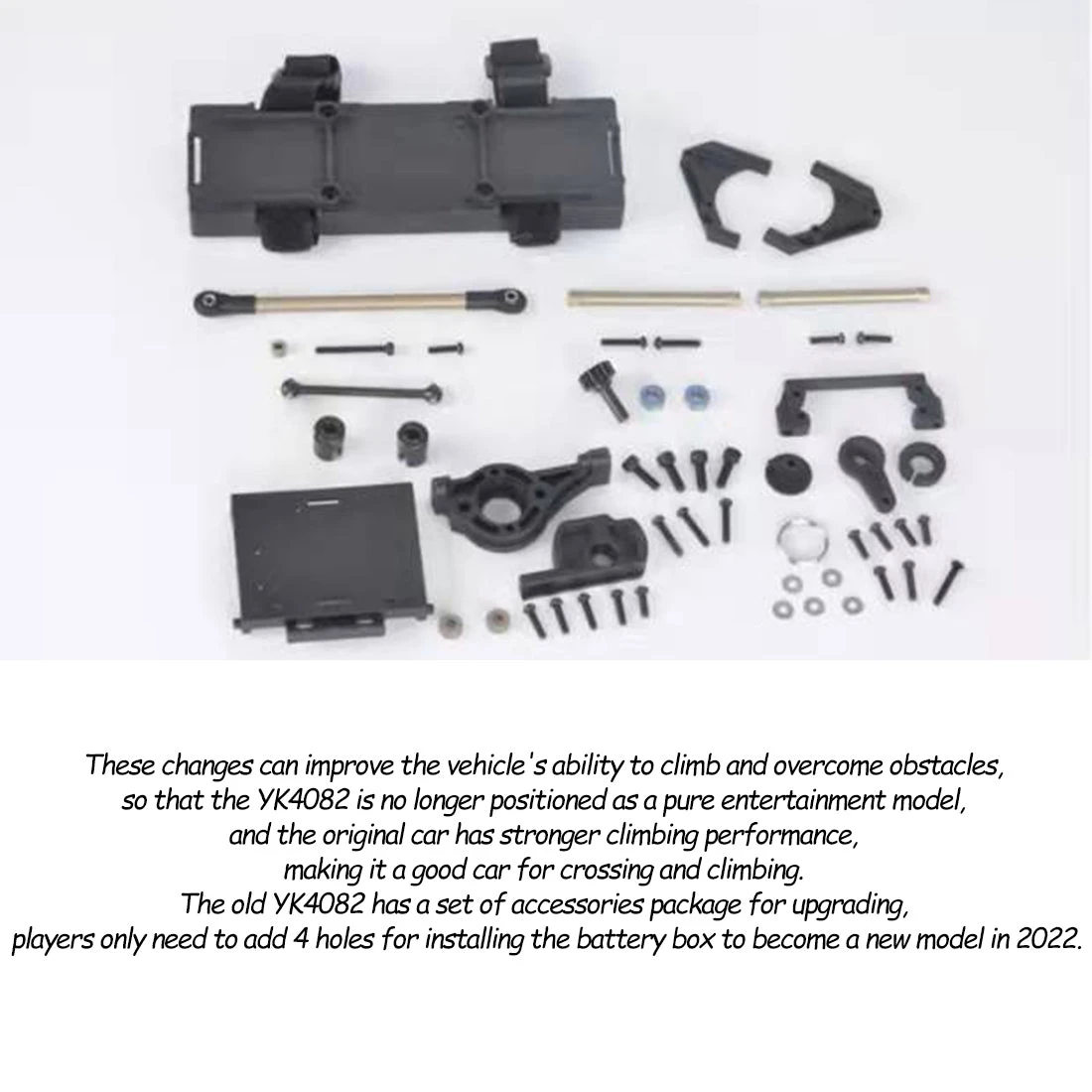 .The YK4082 vehicle is modified for improved obstacle climbing capability and not positioned as a entertainment model merely, providing the original car stronger climbing performance and making it an excellent vehicle for traversing and climbing. The old YK4082 comes with an accessory pack for upgrading and users only need to add four holes for installing the battery compartment to grade up the new 2022 model.