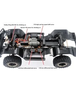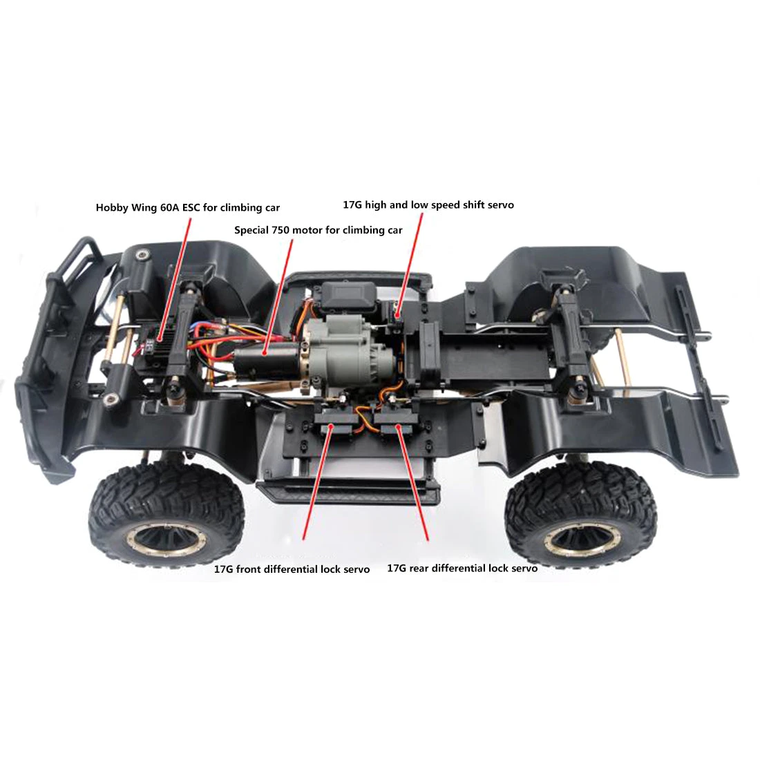 .Stable and Efficient Electronic Equipment: 550 black motor, HobbyWing 60A brushed ESC for climbing car, 9KG all-metal servo x 1, 0.9KG small servo x 3, 2.4G 6-channel remote control (steering, Throttle, front differential lock, rear differential lock, high and low speed switching, extended light control).