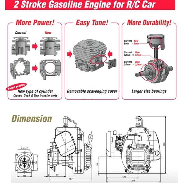 Tips: This is a complete engine including carburetor, air filter, clutch and muffler. The crankshaft is a different (larger) style from the original zenoah engine, so the existing +2mm stroke crankshaft on the market will not be compatible. DDM now provides + 2mm stroke crank. With a 2mm stroke crankshaft installed, the engine will be the Zenoah G340RC engine (bore 38mm, stroke 30mm, 34.02cc). Exhaust port spacing is the same as the original engine, so all exhaust, tuning ducts, etc. will be compatible with. The cylinder includes removable transfer port covers that can be easily removed for easy access to the transmission port