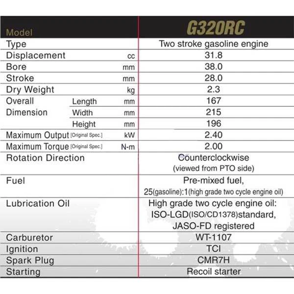 Horsepower (HP) : approximately 3.5HP or more (Test before adding a tuned exhaust), the G290RC is normally rated at 3.5hp, but the G320RC engine is much more powerful than the G290RC, adding a tuned exhaust pipe will further increase the horsepower and torque numbers.